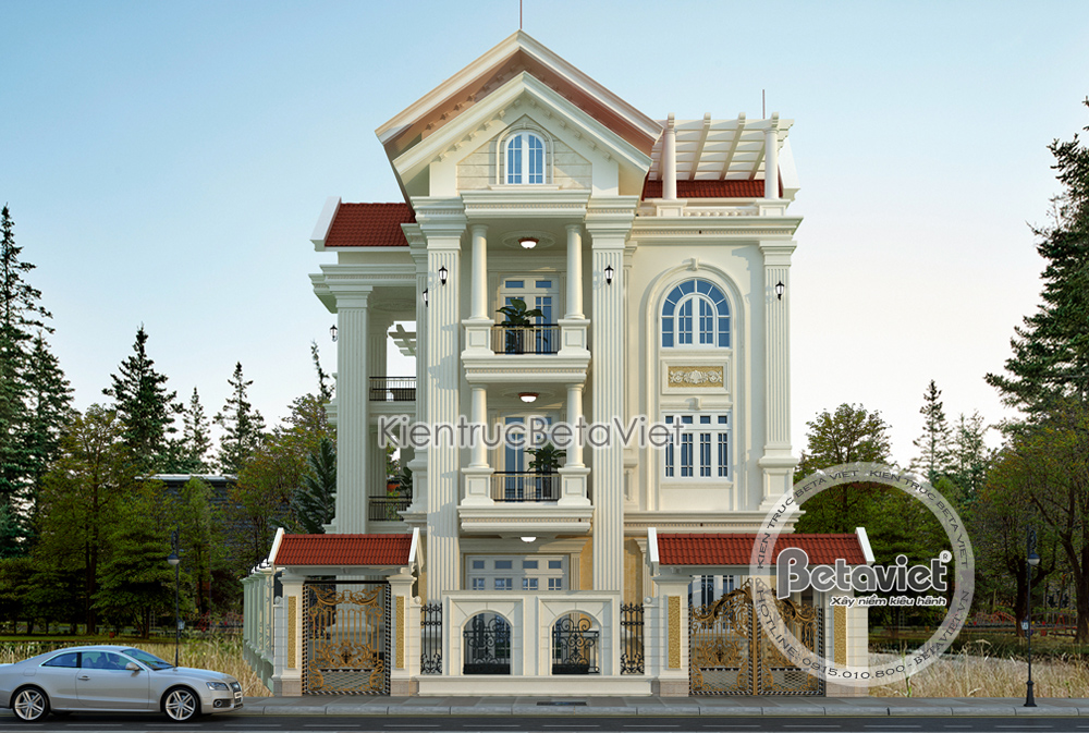 Lấy cảm hứng từ các căn biệt thự châu Âu Tân cổ điển, mẫu biệt thự KT16131 đã ra đời sau bao ngày mong mỏi chờ đợi, đạt được vẻ đẹp tiêu chuẩn, hào hoa và trang nhã. Bố cục ngôi nhà hài hòa hợp lý với những mảng hình khối, kiến trúc đạt tỷ lệ hợp lý, còn về trang trí phào chỉ thì không quá phức tạp, cũng không quá đơn giản, từ đó đạt được hiệu ứng thẩm mỹ cao. Tọa lạc trên mảnh đất hình thang méo, kiến trúc sư Beta Việt đã khéo léo thiết kề ngôi nhà lệch sang phần đất vuông vắn, để phía mặt bên hông ngôi nhà thiết kế sân vườn, tiểu cảnh rất hợp lý.